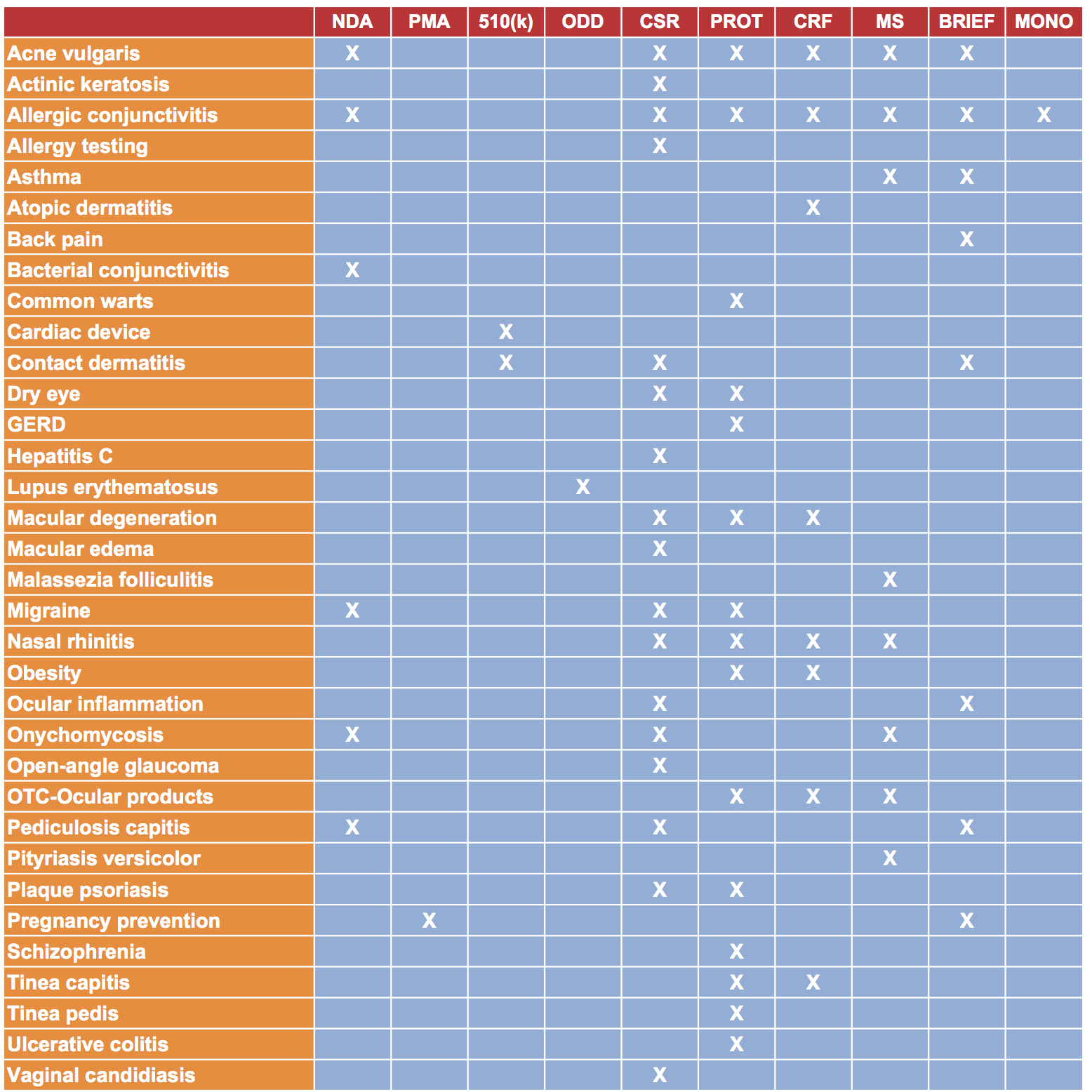 Illuminated Research has experience producing various types of regulatory and scientific documents as indicated below. Within the table, multiple projects may have been conducted within each category (eg, more than one NDA has been prepared for drugs indicated for the treatment of acne vulgaris).